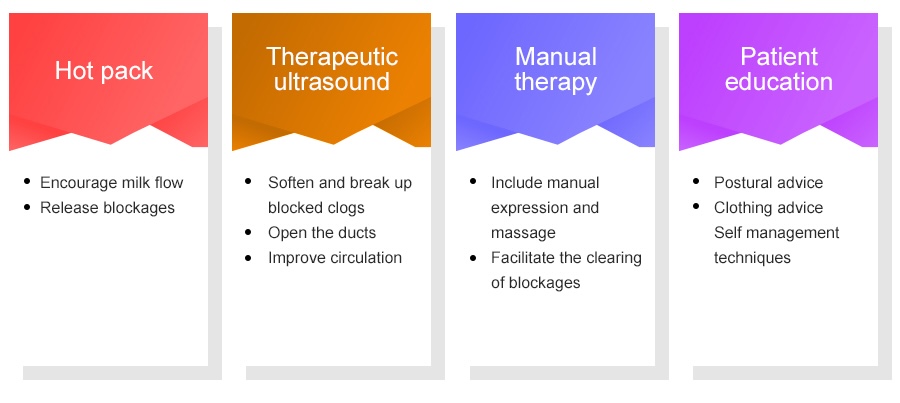 Patients with blocked milk ducts will be scheduled as soon as possible for a physiotherapy session to minimise the risk of progression to mastitis.