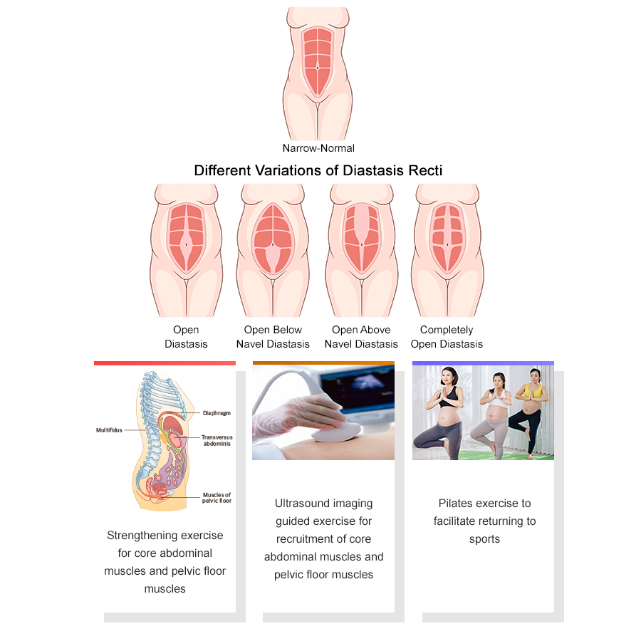 Physiotherapy for patients with abdominal separation or diastasis rectus abdominis muscle (DRAM)include: